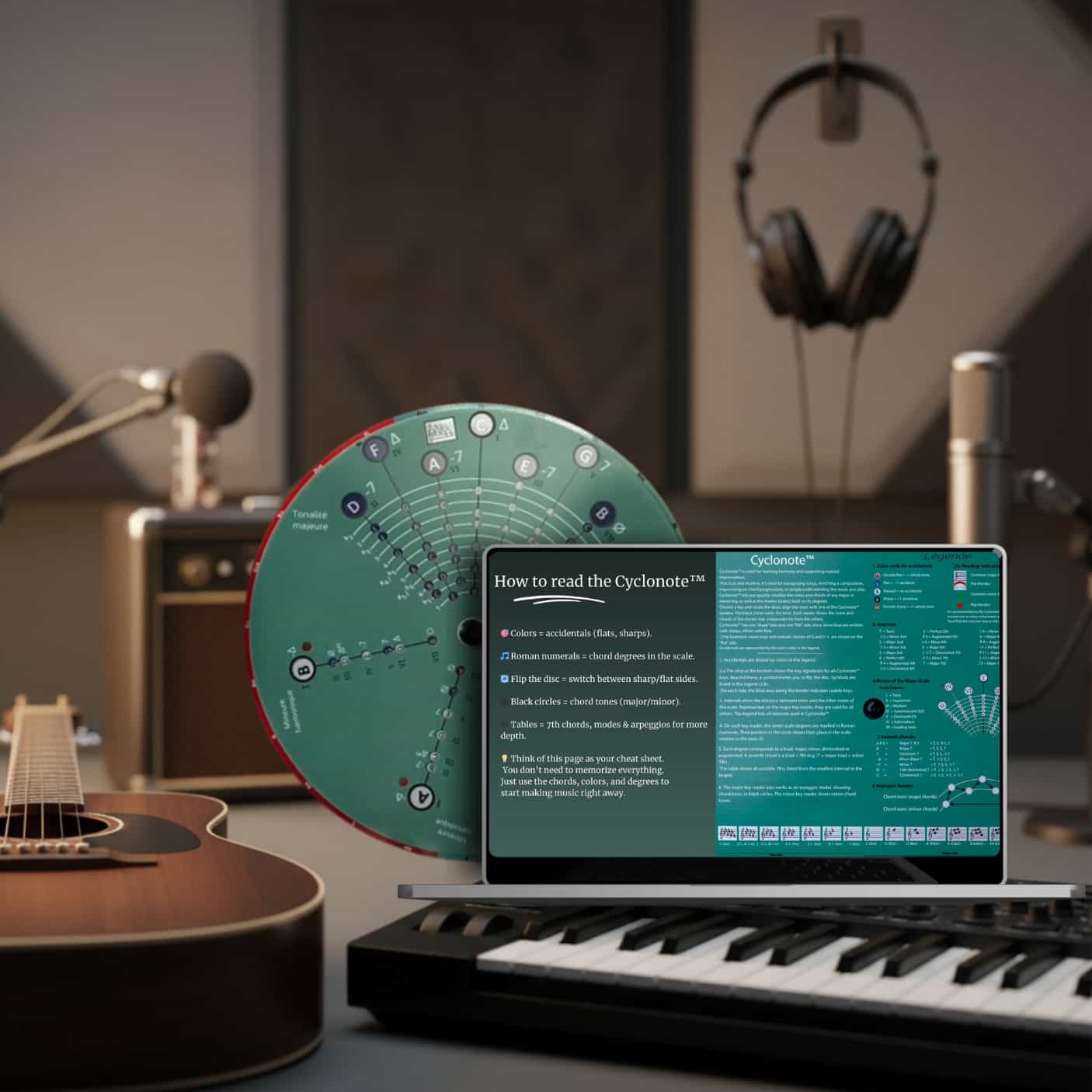 Built on two rotating discs and a unique system of concentric scales, it maps out the hidden logic of tonalities, chords and arpeggios in a circular format.